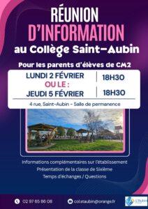 Suite aux portes ouvertes qui se sont déroulées le samedi 24 janvier, le collège Saint-Aubin propose aux familles qui le souhaitent des réunions d’information complémentaires.